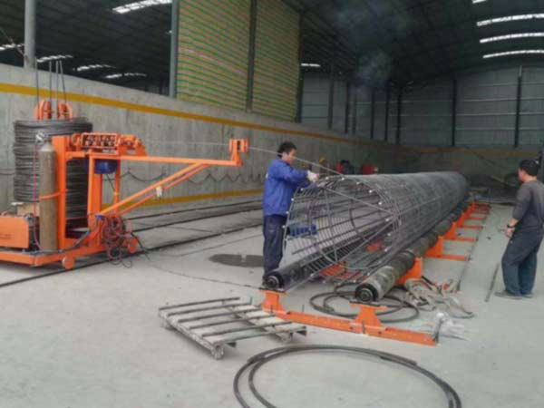 3、机器上骨架制作过程;备齐一节钢筋笼所需箍筋按位置平放两辊轮上,将一根主筋抬放于辊轮长度上方,调整好起始尺寸,竖直箍筋,主筋靠着箍筋单面施焊,待主筋转至上方再补焊。焊完一节主、箍筋,低速转动胶辊,抬二根主筋准备焊接。此时按选定生产工艺确定旋转方向,采用卡具(比子)制作骨架时,待二根主筋或多根主筋焊完后,主筋下行。若采用挂钩工艺则反向旋转,应注意多根主筋焊好后有可能出现偏重,可将骨架旋转在对面位置或错开几根位置后再开始分度焊接,后补齐焊完全部主筋。